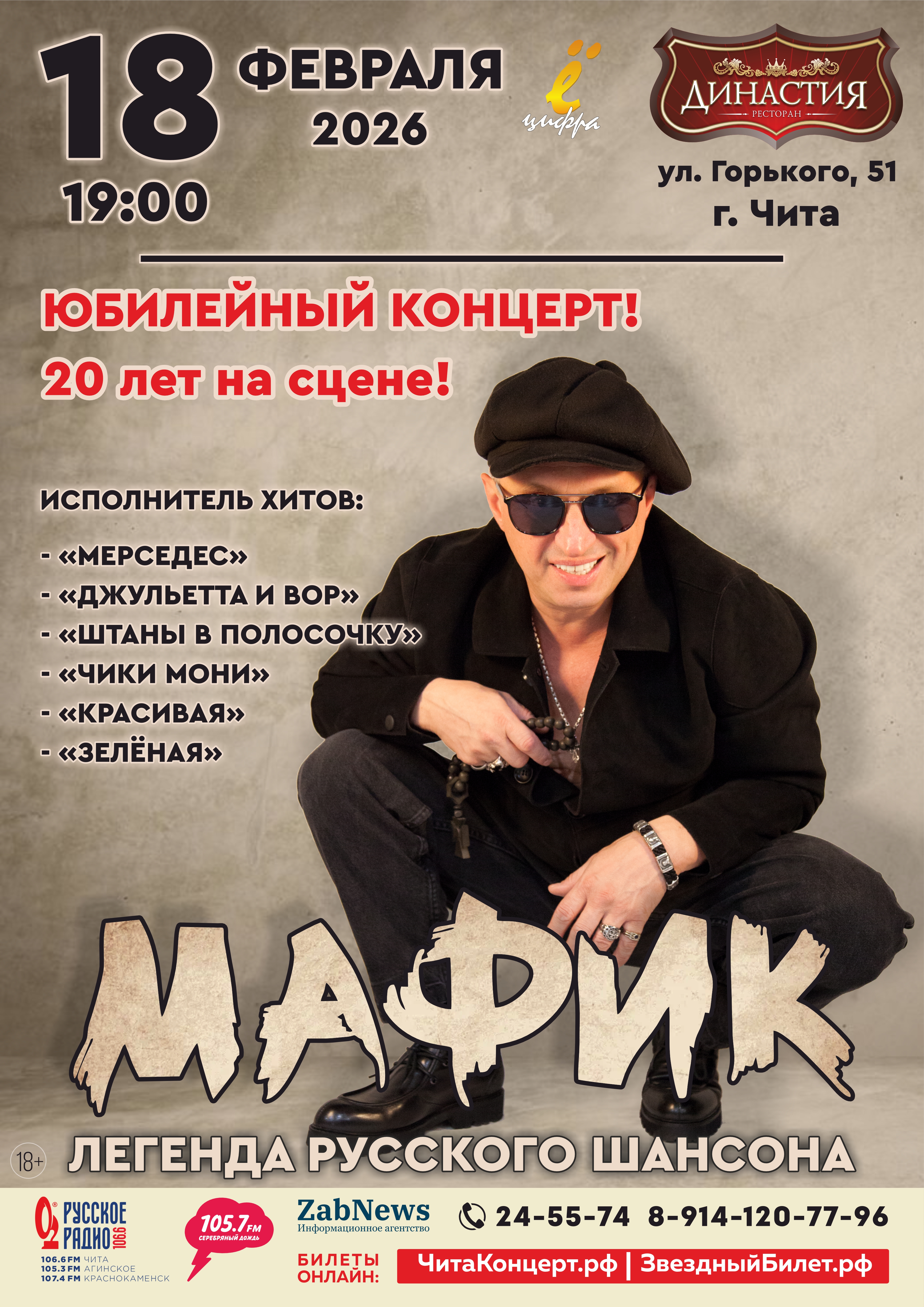 18 февраля в ресторане «Династия» состоится концерт, на котором выступит народно обожаемый исполнитель шансона Денис Мафик! Юбилейный концерт - 20 лет на сцене!