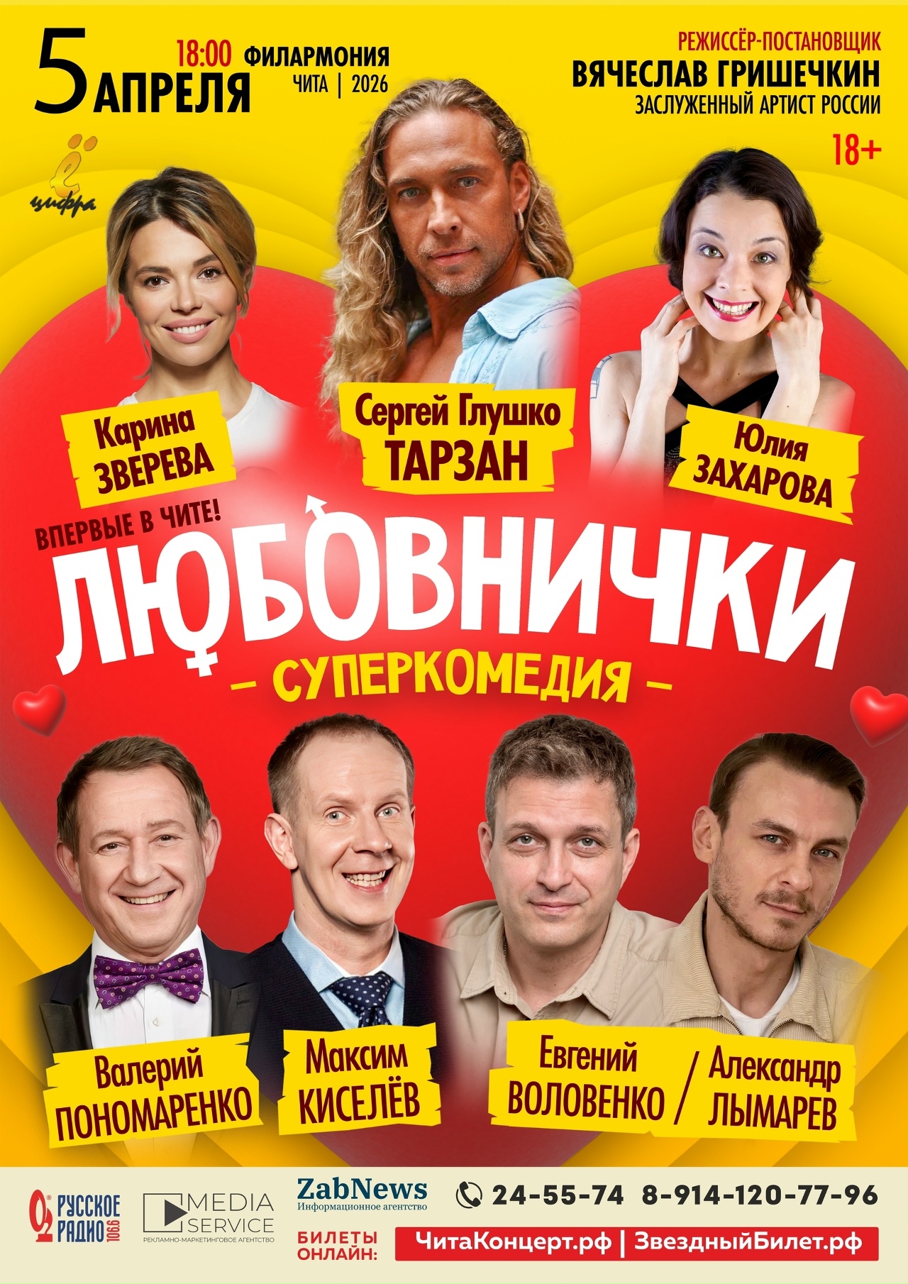 Убойная комедия интересных положений «Любовнички»! Спектакль уже посмотрели 90 000 зрителей более чем в 100 городах! В ролях: Максим Киселев, Сергей «Тарзан» Глушко, Валерий Пономаренко, Александр Лымарев / Евгений Воловенко, Карина Зверева, Юлия Захарова