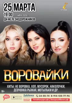 Встречайте! Группа «Воровайки»! Проверенные временем хиты: «Хоп мусорок», «Девчонка рыжая», «Не воровка, не шалава», «Наколочки» и многие другие! Море энергии, зажигательного драйва от трех ураганных девчонок зажгут ваши сердца огнем безудержной «воровайской» энергетики! На концерте Вы окунетесь в незабываемый восторг от живого исполнения, качественного звука и света! Потанцуем вместе с группой «Воровайки»!